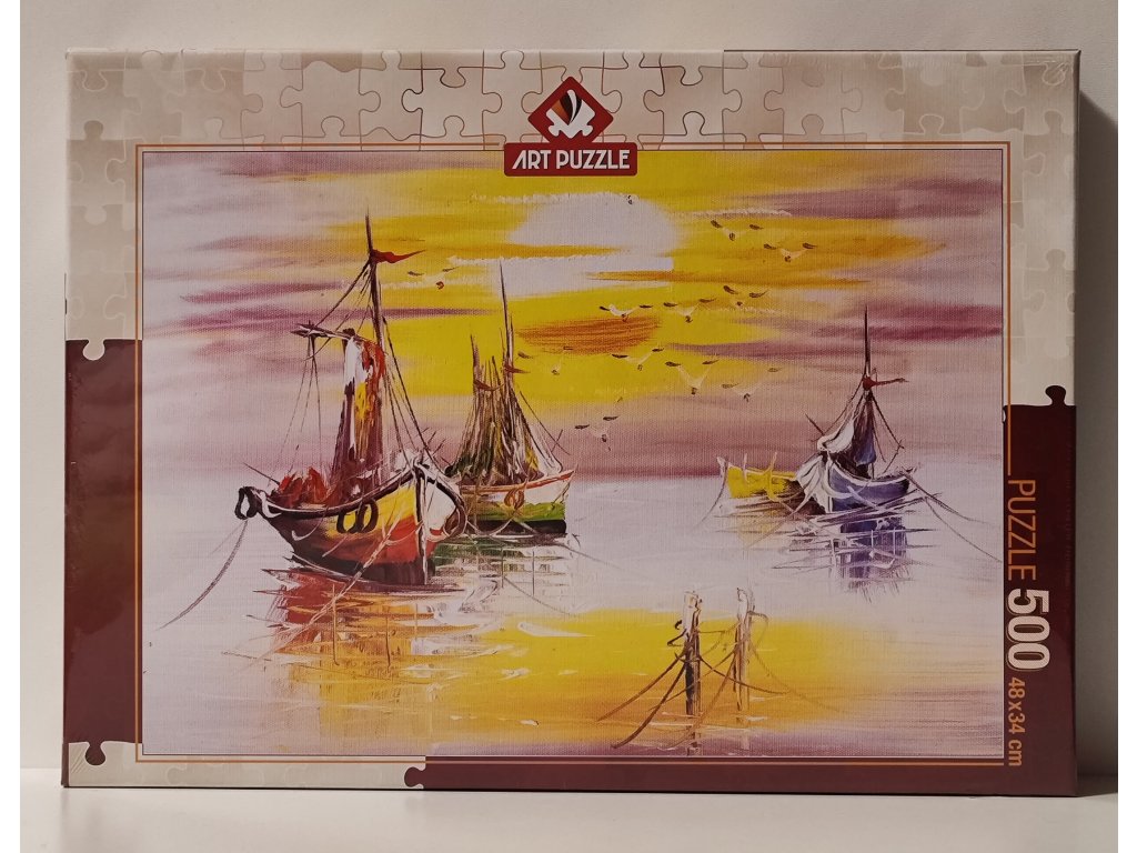 Puzzle Západ slunce od značky Art Puzzle pracuje s jednoduchým, ale velmi klidným motivem. Tři lodě na hladině, teplé tóny zapadajícího slunce a jemné odrazy na vodě vytvářejí obraz, který působí vyrovnaně a meditativně. Nejde o scénu plnou detailů, ale o atmosféru – o světlo, barvy a ticho okamžiku.