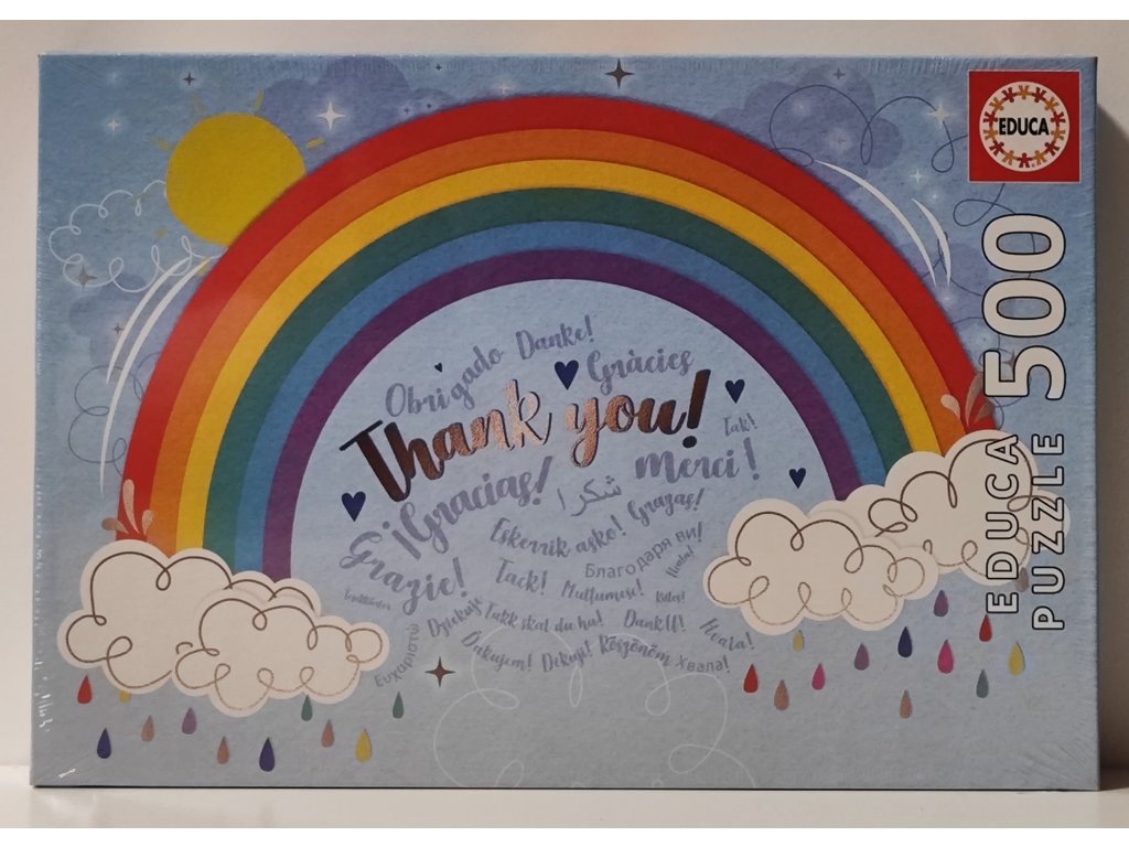 Středový motiv s nápisem „Thank you“ doplněný vícejazyčnými poděkováními dává puzzlím lehce symbolický rozměr. Oblaka, kapky a drobné grafické prvky rozbíjejí plochy barev tak, aby skládání zůstalo přehledné, ale ne jednotvárné.