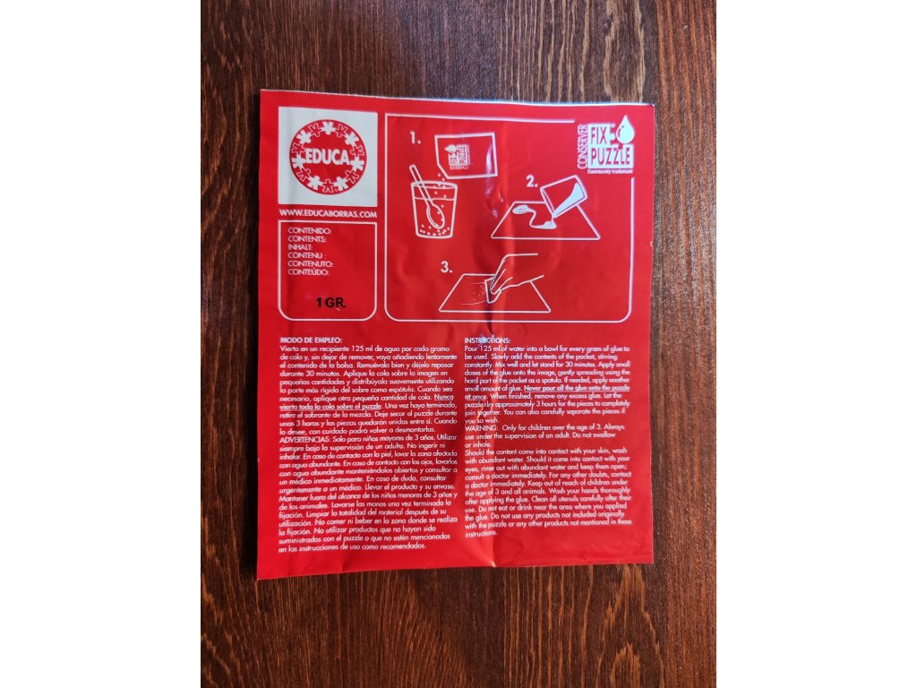 Ke všem puzzle Educa od 500 do 2 000 dílků (včetně) přidává speciální lepidlo FIX PUZZLE®, díky kterému si můžete hotové puzzle zafixovat a zavěsit.